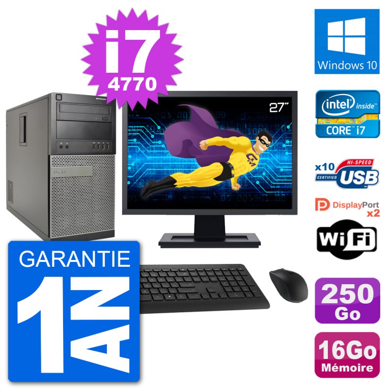 PC Dell 7020 MT - Intel Core i7-4770 3.4 Ghz (8 Mo) - 16 Go DDR3 - Disque Dur 3,5" 250 Go - Graveur DVD - Clef Wifi USB - Windows 10 - Livré avec Ecran 27" + clavier + souris (Marques et modèles variables) - Garantie 1 an.