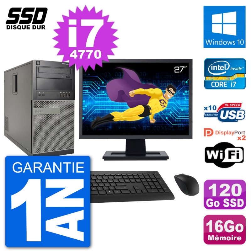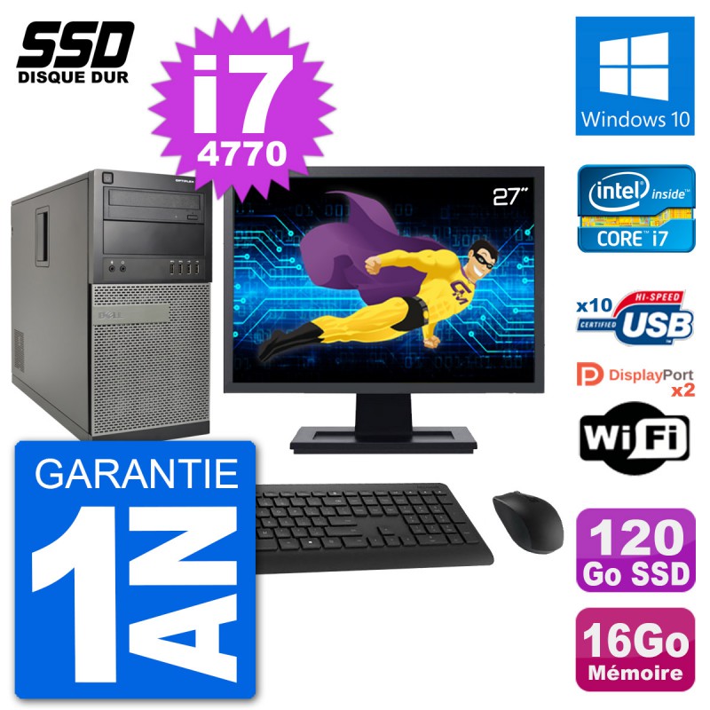 PC Dell 7020 MT - Intel Core i7-4770 3.4 Ghz (8 Mo) - 16 Go DDR3 - Disque Dur SSD 120 Go - Graveur DVD - Clef Wifi USB - Windows 10 - Livré avec Ecran 27" + clavier + souris (Marques et modèles variables) - Garantie 1 an.