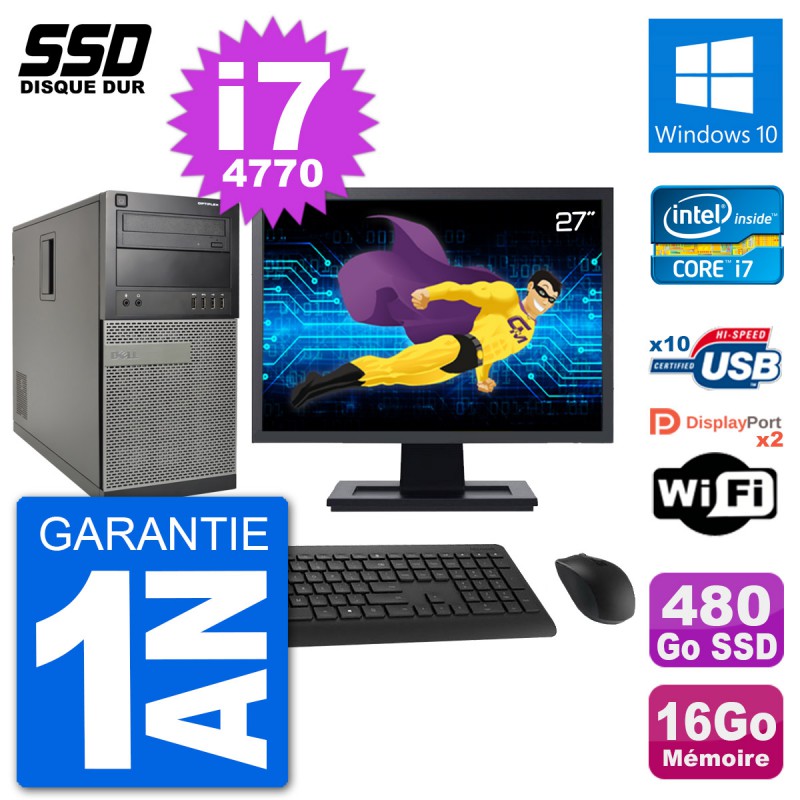PC Dell 7020 MT - Intel Core i7-4770 3.4 Ghz (8 Mo) - 16 Go DDR3 - Disque Dur SSD 480 Go - Graveur DVD - Clef Wifi USB - Windows 10 - Livré avec Ecran 27" + clavier + souris (Marques et modèles variables) - Garantie 1 an.