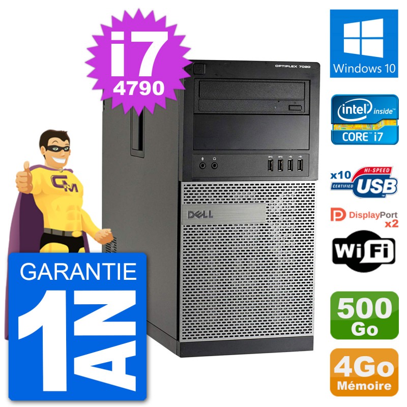 PC Dell Optiplex 7020 MT (Moyenne Tour) - Intel Core i7-4790 3.6 Ghz (8 Mo) - 4 Go DDR3 - Disque Dur 3,5" 500 Go - Graveur DVD - Clef Wifi USB - Windows 10 - Garantie 1 an.
