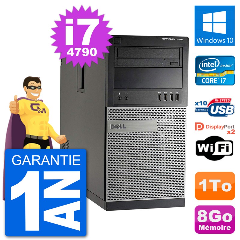 PC Dell Optiplex 7020 MT (Moyenne Tour) - Intel Core i7-4790 3.6 Ghz (8 Mo) - 8 Go DDR3 - Disque Dur 3,5" 1 To - Graveur DVD - Clef Wifi USB - Windows 10 - Garantie 1 an.
