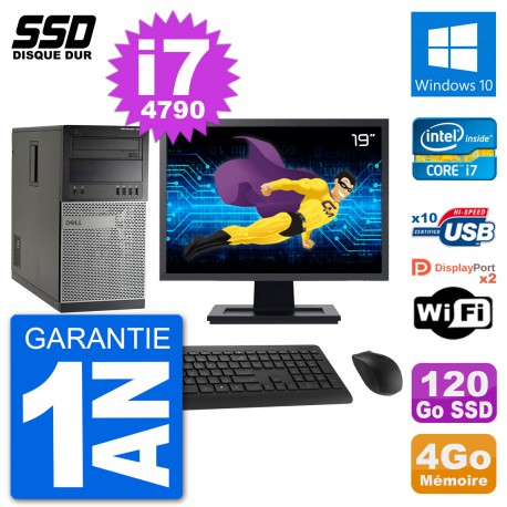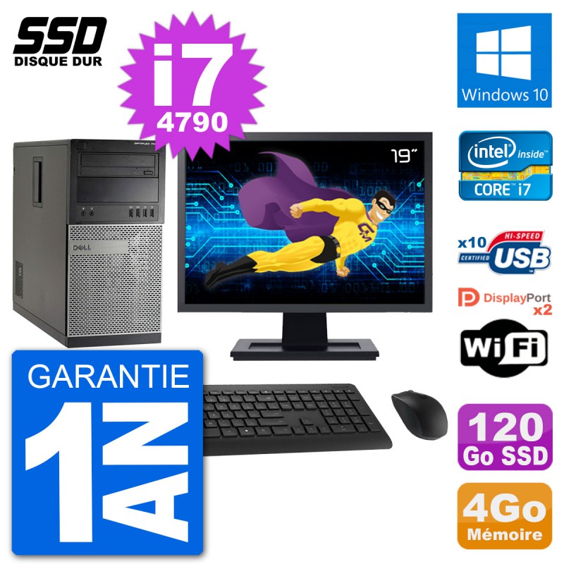 PC Dell 7020 MT - Intel Core i7-4790 3.6 Ghz (8 Mo) - 4 Go DDR3 - Disque Dur SSD 120 Go - Graveur DVD - Clef Wifi USB - Windows 10 - Livré avec Ecran 19" + clavier + souris (Marques et modèles variables) - Garantie 1 an.