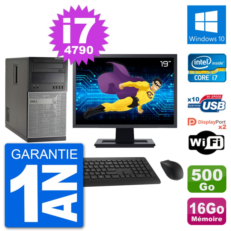 PC Dell 7020 MT - Intel Core i7-4790 3.6 Ghz (8 Mo) - 16 Go DDR3 - Disque Dur 3,5" 500 Go - Graveur DVD - Clef Wifi USB - Windows 10 - Livré avec Ecran 19" + clavier + souris (Marques et modèles variables) - Garantie 1 an.