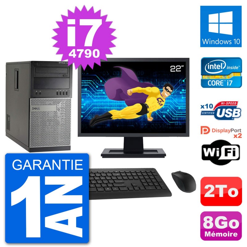 PC Dell 7020 MT - Intel Core i7-4790 3.6 Ghz (8 Mo) - 8 Go DDR3 - Disque Dur 3,5" 2 To - Graveur DVD - Clef Wifi USB - Windows 10 - Livré avec Ecran 22" + clavier + souris (Marques et modèles variables) - Garantie 1 an.