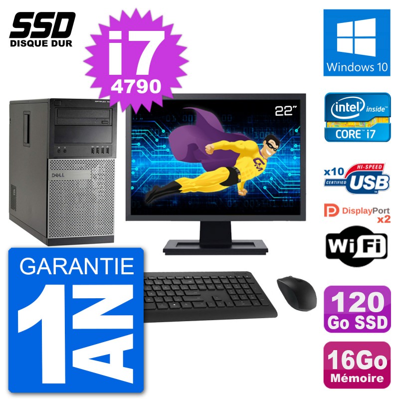 PC Dell 7020 MT - Intel Core i7-4790 3.6 Ghz (8 Mo) - 16 Go DDR3 - Disque Dur SSD 120 Go - Graveur DVD - Clef Wifi USB - Windows 10 - Livré avec Ecran 22" + clavier + souris (Marques et modèles variables) - Garantie 1 an.