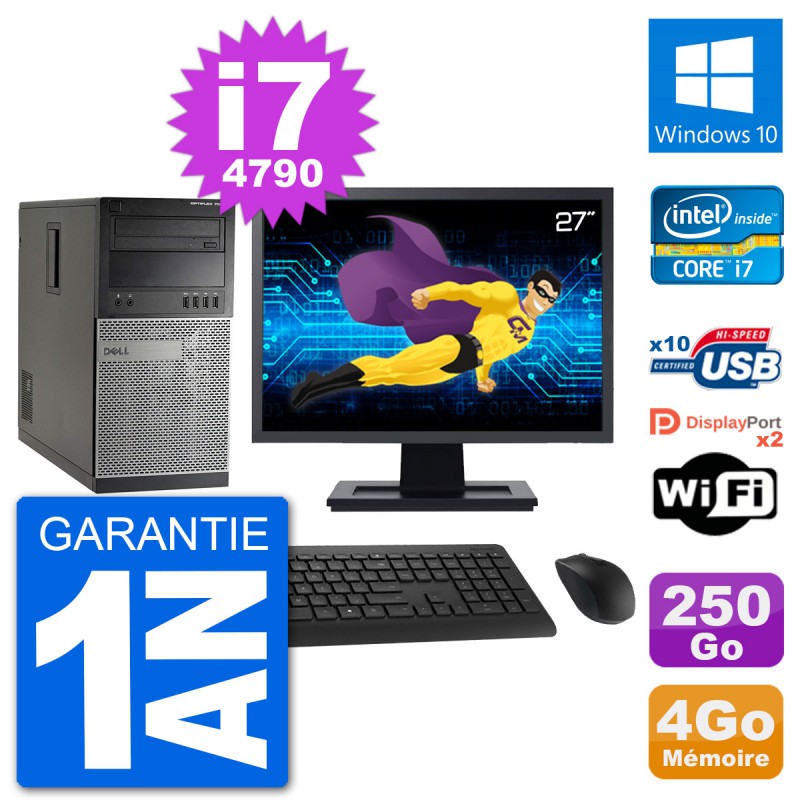 PC Dell 7020 MT - Intel Core i7-4790 3.6 Ghz (8 Mo) - 4 Go DDR3 - Disque Dur 3,5" 250 Go - Graveur DVD - Clef Wifi USB - Windows 10 - Livré avec Ecran 27" + clavier + souris (Marques et modèles variables) - Garantie 1 an.