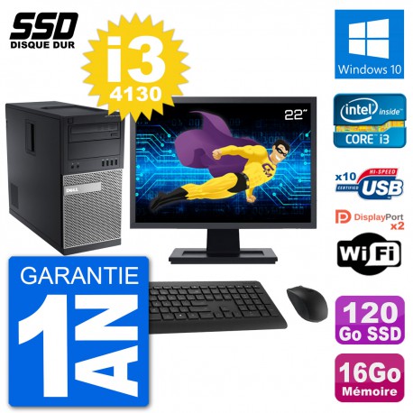 PC Dell 9020 MT - Intel Core i3-4130 3.4 Ghz (3 Mo) - 16 Go DDR3 - Disque Dur SSD 120 Go - Graveur DVD - Clef Wifi USB - Windows 10 - Livré avec Ecran 22" + clavier + souris (Marques et modèles variables) - Garantie 1 an.