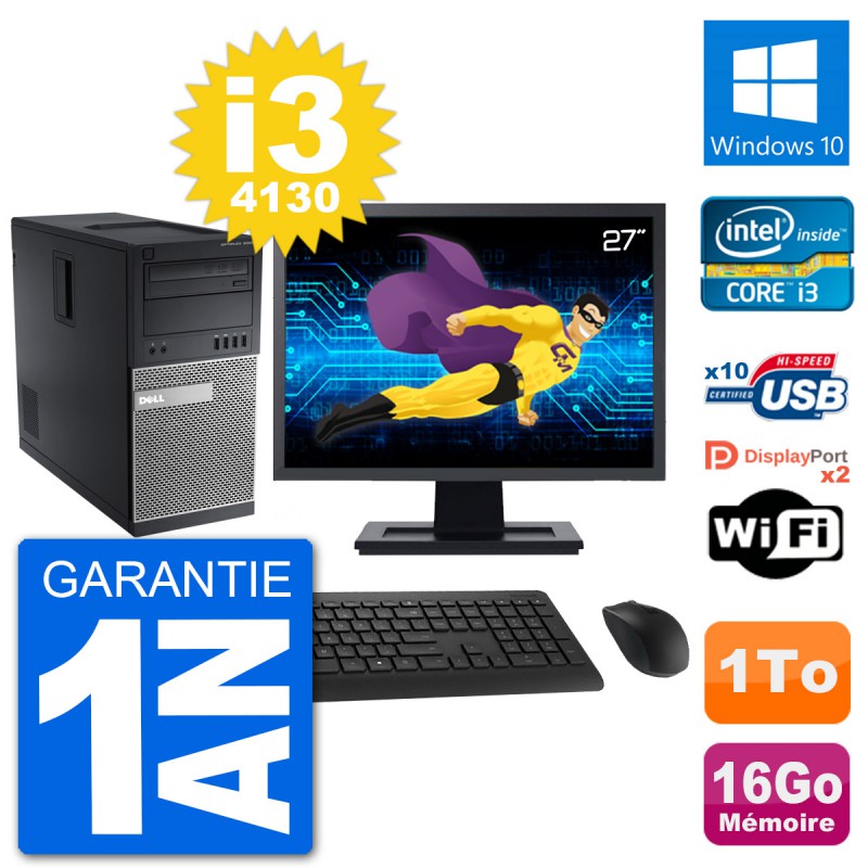 PC Dell 9020 MT - Intel Core i3-4130 3.4 Ghz (3 Mo) - 16 Go DDR3 - Disque Dur 3,5" 1 To - Graveur DVD - Clef Wifi USB - Windows 10 - Livré avec Ecran 27" + clavier + souris (Marques et modèles variables) - Garantie 1 an.