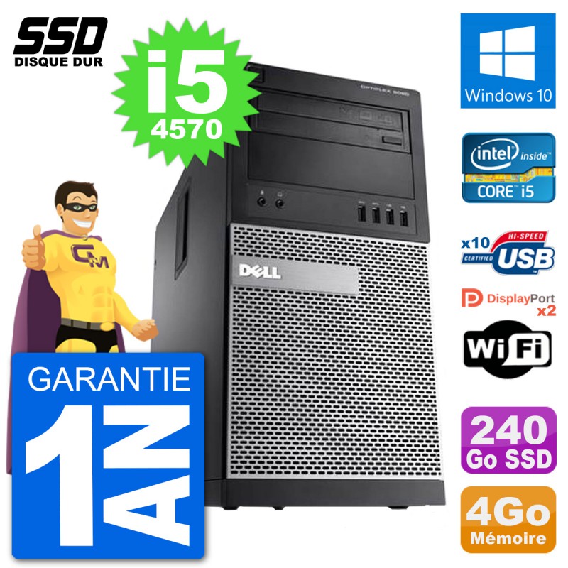 PC Dell Optiplex 9020 MT (Moyenne Tour) - Intel Core i5-4570 3.2 Ghz (6 Mo) - 4 Go DDR3 - Disque Dur SSD 240 Go - Graveur DVD - Clef Wifi USB - Windows 10 - Garantie 1 an.
