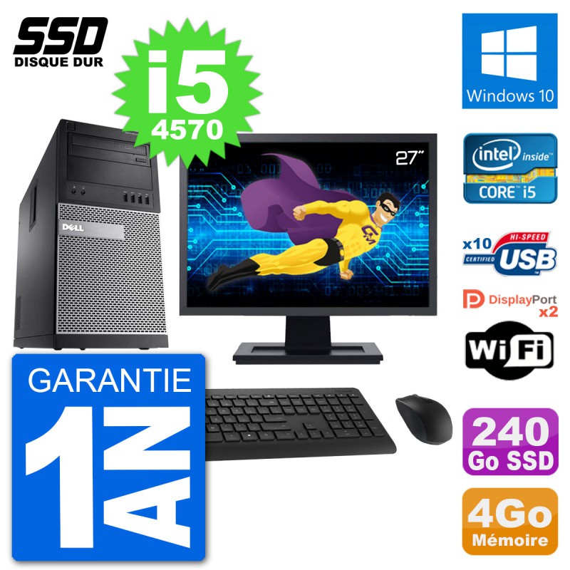 PC Dell 9020 MT - Intel Core i5-4570 3.2 Ghz (6 Mo) - 4 Go DDR3 - Disque Dur SSD 240 Go - Graveur DVD - Clef Wifi USB - Windows 10 - Livré avec Ecran 27" + clavier + souris (Marques et modèles variables) - Garantie 1 an.