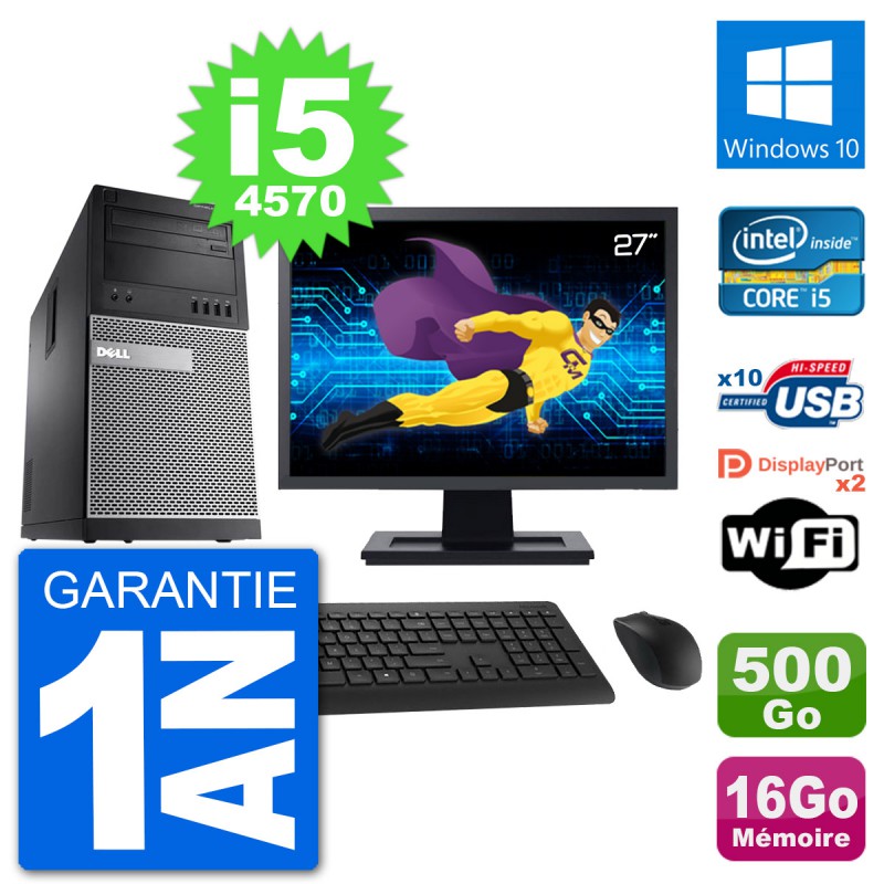 PC Dell 9020 MT - Intel Core i5-4570 3.2 Ghz (6 Mo) - 16 Go DDR3 - Disque Dur 3,5" 500 Go - Graveur DVD - Clef Wifi USB - Windows 10 - Livré avec Ecran 27" + clavier + souris (Marques et modèles variables) - Garantie 1 an.