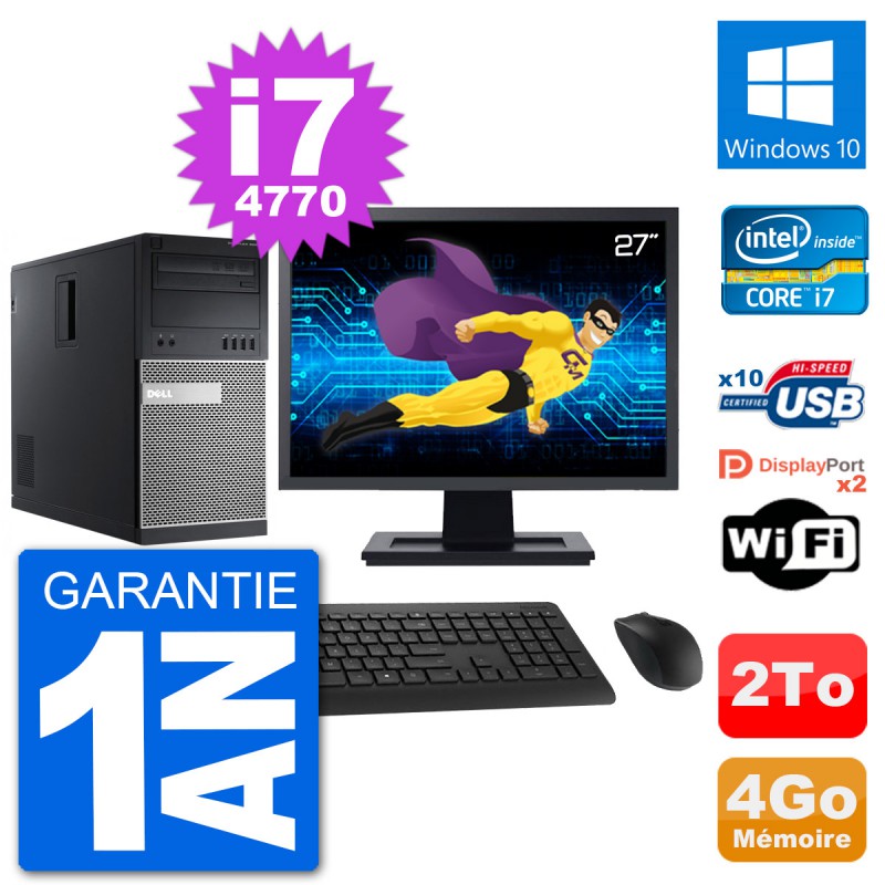 PC Dell 9020 MT - Intel Core i7-4770 3.4 Ghz (8 Mo) - 4 Go DDR3 - Disque Dur 3,5" 2 To - Graveur DVD - Clef Wifi USB - Windows 10 - Livré avec Ecran 27" + clavier + souris (Marques et modèles variables) - Garantie 1 an.
