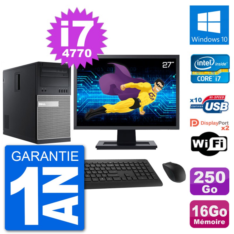 PC Dell 9020 MT - Intel Core i7-4770 3.4 Ghz (8 Mo) - 16 Go DDR3 - Disque Dur 3,5" 250 Go - Graveur DVD - Clef Wifi USB - Windows 10 - Livré avec Ecran 27" + clavier + souris (Marques et modèles variables) - Garantie 1 an.