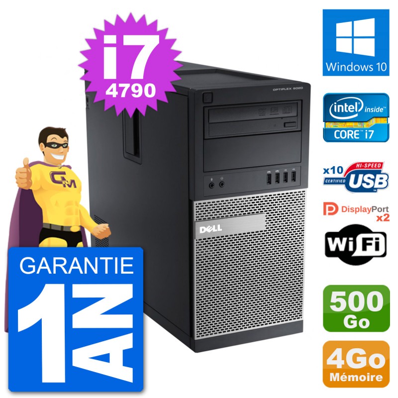 PC Dell Optiplex 9020 MT (Moyenne Tour) - Intel Core i7-4790 3.6 Ghz (8 Mo) - 4 Go DDR3 - Disque Dur 3,5" 500 Go - Graveur DVD - Clef Wifi USB - Windows 10 - Garantie 1 an.