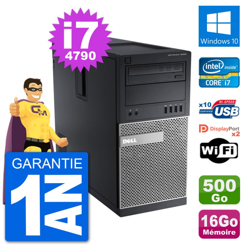PC Dell Optiplex 9020 MT (Moyenne Tour) - Intel Core i7-4790 3.6 Ghz (8 Mo) - 16 Go DDR3 - Disque Dur 3,5" 500 Go - Graveur DVD - Clef Wifi USB - Windows 10 - Garantie 1 an.