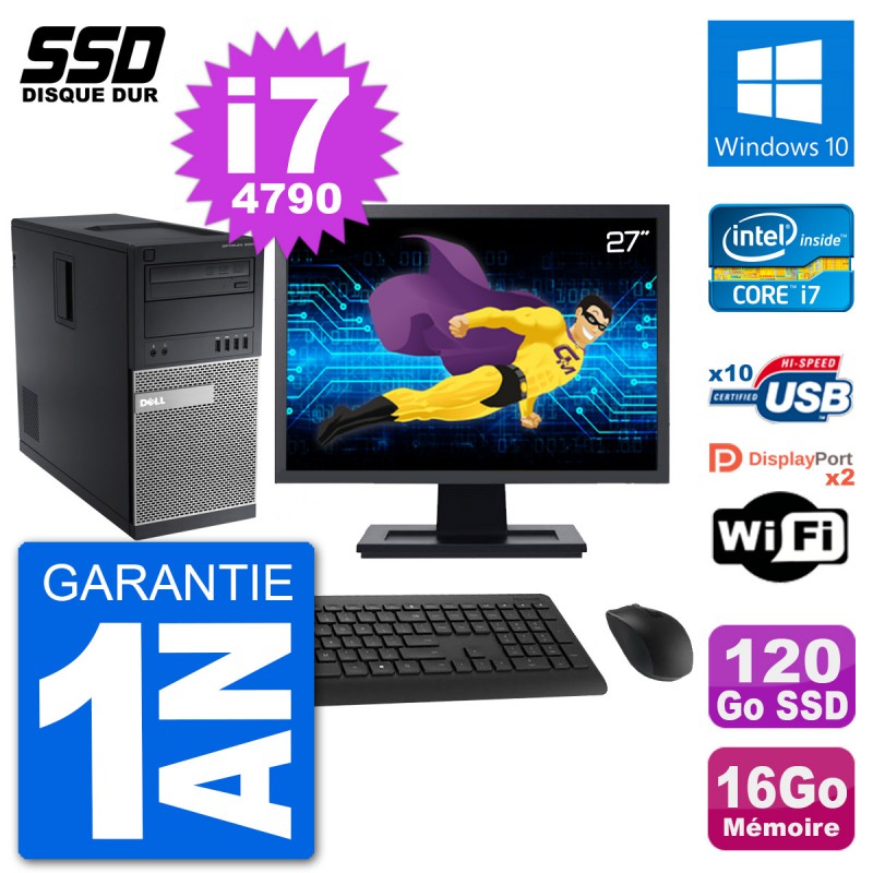 PC Dell 9020 MT - Intel Core i7-4790 3.6 Ghz (8 Mo) - 16 Go DDR3 - Disque Dur SSD 120 Go - Graveur DVD - Clef Wifi USB - Windows 10 - Livré avec Ecran 27" + clavier + souris (Marques et modèles variables) - Garantie 1 an.