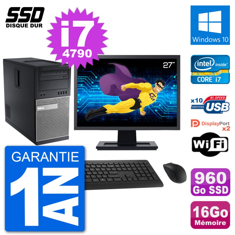 PC Dell 9020 MT - Intel Core i7-4790 3.6 Ghz (8 Mo) - 16 Go DDR3 - Disque Dur SSD 960 Go - Graveur DVD - Clef Wifi USB - Windows 10 - Livré avec Ecran 27" + clavier + souris (Marques et modèles variables) - Garantie 1 an.