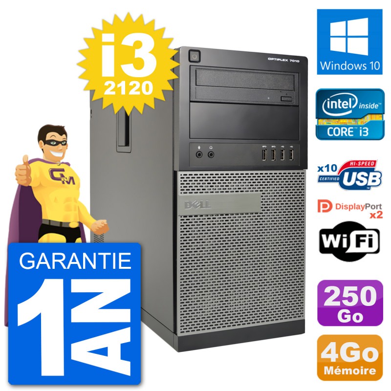 PC Dell Optiplex 7010 MT (Moyenne Tour) - Intel Core i3-2120 3.3 Ghz (3 Mo) - 4 Go DDR3 - Disque Dur 3,5" 250 Go - Graveur DVD - Clef Wifi USB - Windows 10 - Garantie 1 an.