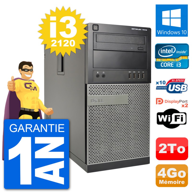 PC Dell Optiplex 7010 MT (Moyenne Tour) - Intel Core i3-2120 3.3 Ghz (3 Mo) - 4 Go DDR3 - Disque Dur 3,5" 2 To - Graveur DVD - Clef Wifi USB - Windows 10 - Garantie 1 an.