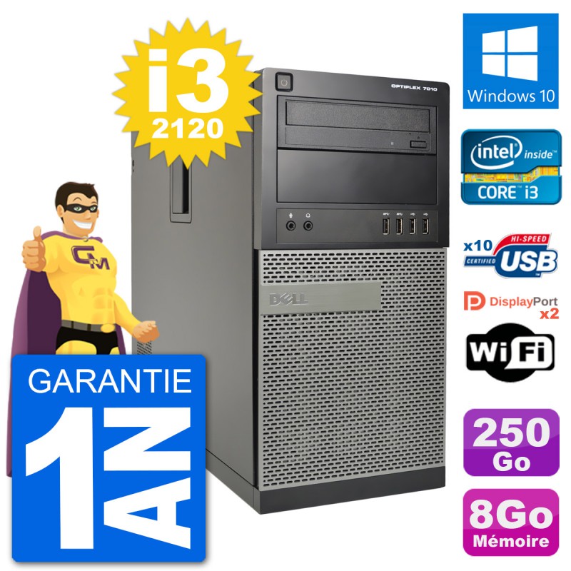 PC Dell Optiplex 7010 MT (Moyenne Tour) - Intel Core i3-2120 3.3 Ghz (3 Mo) - 8 Go DDR3 - Disque Dur 3,5" 250 Go - Graveur DVD - Clef Wifi USB - Windows 10 - Garantie 1 an.