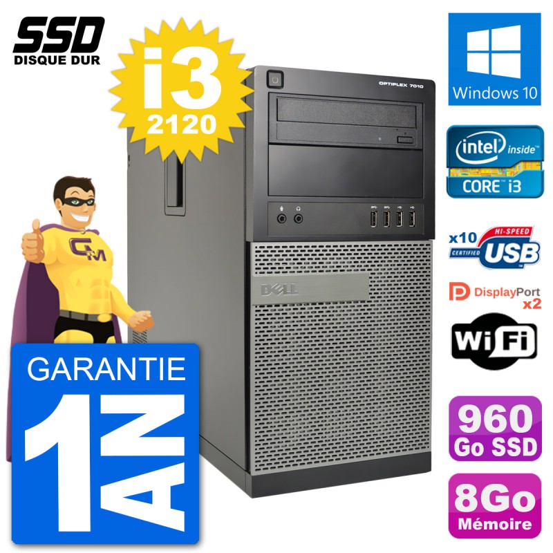 PC Dell Optiplex 7010 MT (Moyenne Tour) - Intel Core i3-2120 3.3 Ghz (3 Mo) - 8 Go DDR3 - Disque Dur SSD 960 Go - Graveur DVD - Clef Wifi USB - Windows 10 - Garantie 1 an.