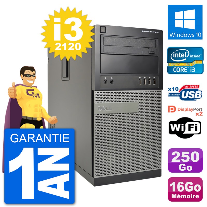 PC Dell Optiplex 7010 MT (Moyenne Tour) - Intel Core i3-2120 3.3 Ghz (3 Mo) - 16 Go DDR3 - Disque Dur 3,5" 250 Go - Graveur DVD - Clef Wifi USB - Windows 10 - Garantie 1 an.
