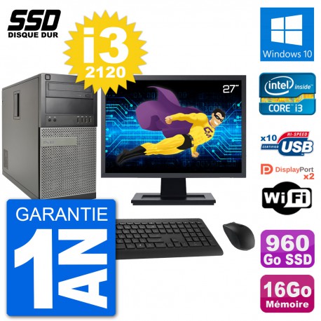 PC Dell 7010 MT - Intel Core i3-2120 3.3 Ghz (3 Mo) - 16 Go DDR3 - Disque Dur SSD 960 Go - Graveur DVD - Clef Wifi USB - Windows 10 - Livré avec Ecran 27" + clavier + souris (Marques et modèles variables) - Garantie 1 an.