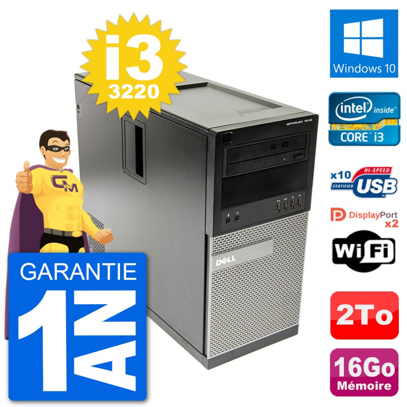 PC Dell Optiplex 7010 MT (Moyenne Tour) - Intel Core i3-3220 3.3 Ghz (3 Mo) - 16 Go DDR3 - Disque Dur 3,5" 2 To - Graveur DVD - Clef Wifi USB - Windows 10 - Garantie 1 an.