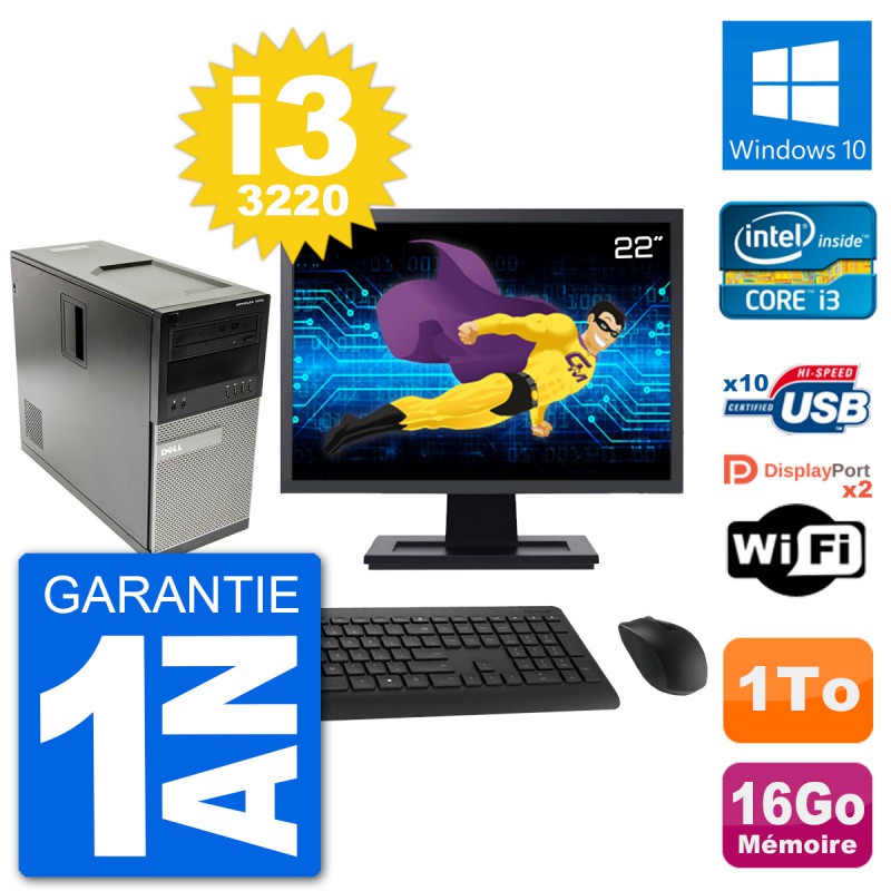 PC Dell 7010 MT - Intel Core i3-3220 3.3 Ghz (3 Mo) - 16 Go DDR3 - Disque Dur 3,5" 1 To - Graveur DVD - Clef Wifi USB - Windows 10 - Livré avec Ecran 22" + clavier + souris (Marques et modèles variables) - Garantie 1 an.