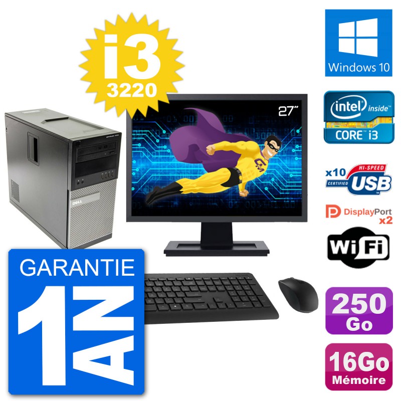 PC Dell 7010 MT - Intel Core i3-3220 3.3 Ghz (3 Mo) - 16 Go DDR3 - Disque Dur 3,5" 250 Go - Graveur DVD - Clef Wifi USB - Windows 10 - Livré avec Ecran 27" + clavier + souris (Marques et modèles variables) - Garantie 1 an.
