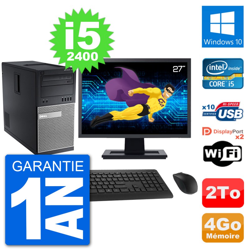 PC Dell 7010 MT - Intel Core i5-2400 3.1 Ghz (6 Mo) - 4 Go DDR3 - Disque Dur 3,5" 2 To - Graveur DVD - Clef Wifi USB - Windows 10 - Livré avec Ecran 27" + clavier + souris (Marques et modèles variables) - Garantie 1 an.