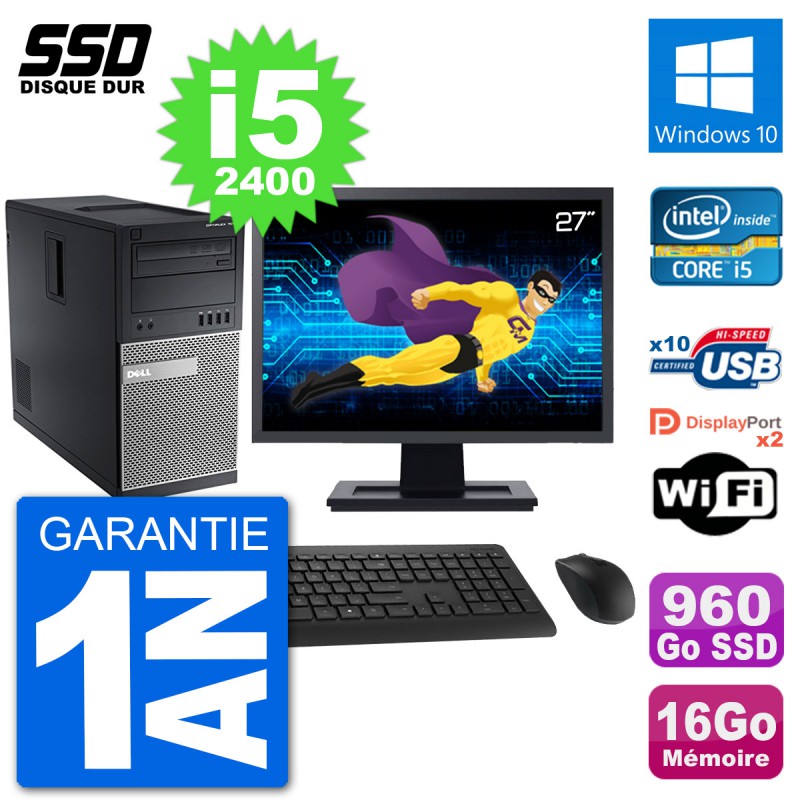 PC Dell 7010 MT - Intel Core i5-2400 3.1 Ghz (6 Mo) - 16 Go DDR3 - Disque Dur SSD 960 Go - Graveur DVD - Clef Wifi USB - Windows 10 - Livré avec Ecran 27" + clavier + souris (Marques et modèles variables) - Garantie 1 an.
