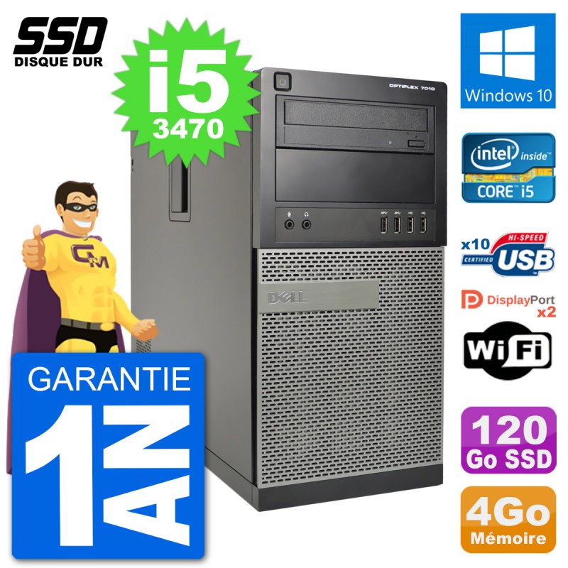 PC Dell Optiplex 7010 MT (Moyenne Tour) - Intel Core i5-3470 3.2 Ghz (6 Mo) - 4 Go DDR3 - Disque Dur SSD 120 Go - Graveur DVD - Clef Wifi USB - Windows 10 - Garantie 1 an.