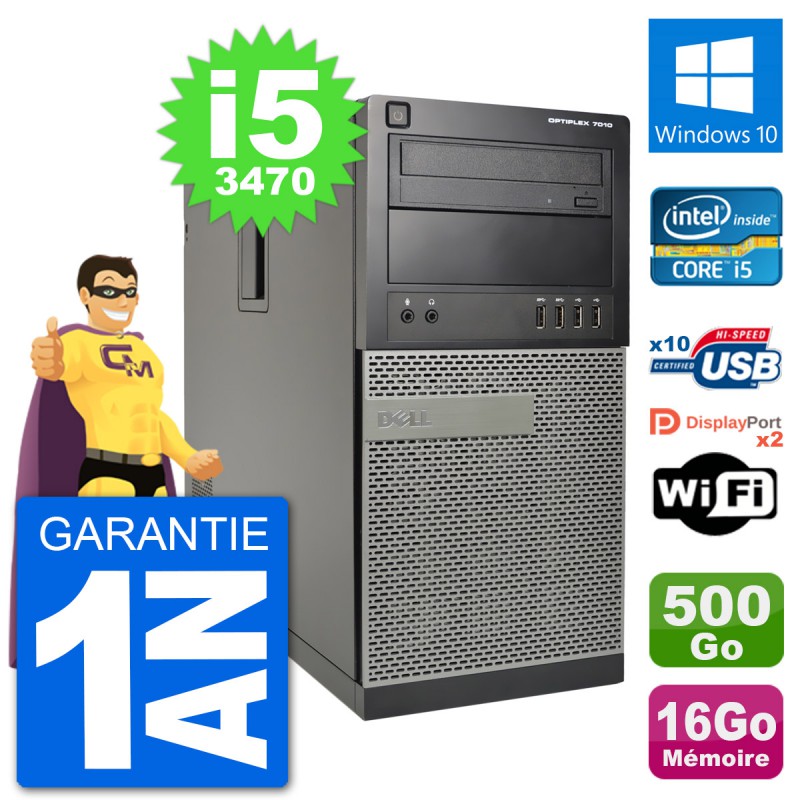 PC Dell Optiplex 7010 MT (Moyenne Tour) - Intel Core i5-3470 3.2 Ghz (6 Mo) - 16 Go DDR3 - Disque Dur 3,5" 500 Go - Graveur DVD - Clef Wifi USB - Windows 10 - Garantie 1 an.