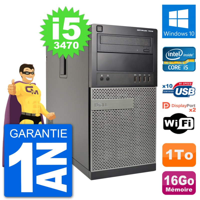 PC Dell Optiplex 7010 MT (Moyenne Tour) - Intel Core i5-3470 3.2 Ghz (6 Mo) - 16 Go DDR3 - Disque Dur 3,5" 1 To - Graveur DVD - Clef Wifi USB - Windows 10 - Garantie 1 an.