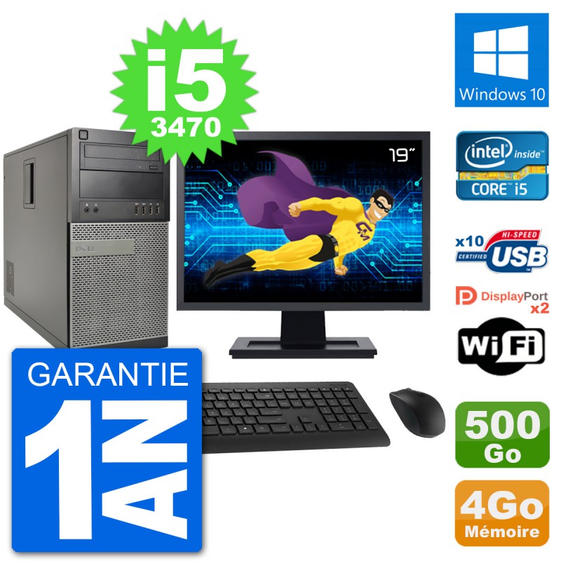 PC Dell 7010 MT - Intel Core i5-3470 3.2 Ghz (6 Mo) - 4 Go DDR3 - Disque Dur 3,5" 500 Go - Graveur DVD - Clef Wifi USB - Windows 10 - Livré avec Ecran 19" + clavier + souris (Marques et modèles variables) - Garantie 1 an.