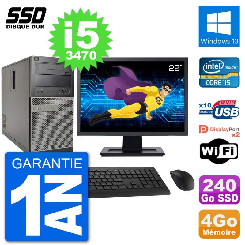 PC Dell 7010 MT - Intel Core i5-3470 3.2 Ghz (6 Mo) - 4 Go DDR3 - Disque Dur SSD 240 Go - Graveur DVD - Clef Wifi USB - Windows 10 - Livré avec Ecran 22" + clavier + souris (Marques et modèles variables) - Garantie 1 an.