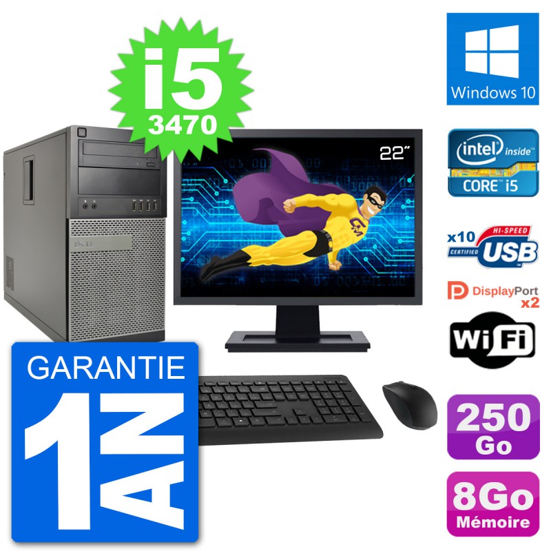 PC Dell 7010 MT - Intel Core i5-3470 3.2 Ghz (6 Mo) - 8 Go DDR3 - Disque Dur 3,5" 250 Go - Graveur DVD - Clef Wifi USB - Windows 10 - Livré avec Ecran 22" + clavier + souris (Marques et modèles variables) - Garantie 1 an.
