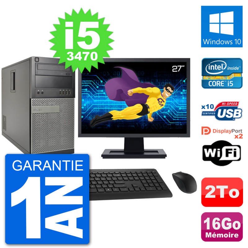 PC Dell 7010 MT - Intel Core i5-3470 3.2 Ghz (6 Mo) - 16 Go DDR3 - Disque Dur 3,5" 2 To - Graveur DVD - Clef Wifi USB - Windows 10 - Livré avec Ecran 27" + clavier + souris (Marques et modèles variables) - Garantie 1 an.