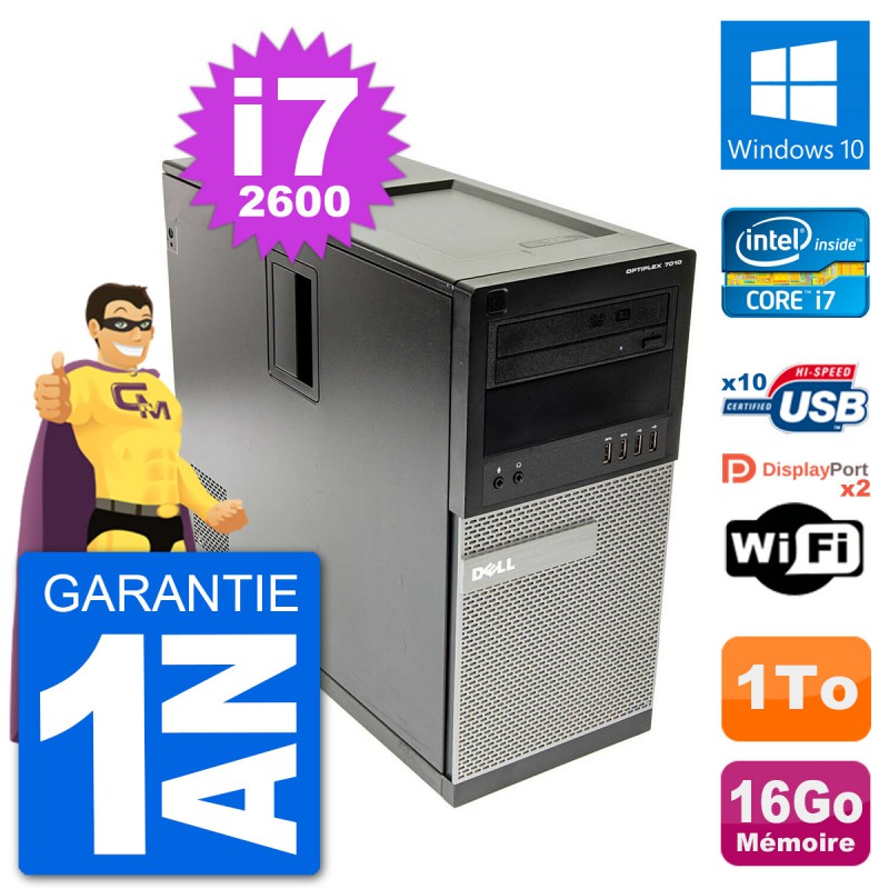 PC Dell Optiplex 7010 MT (Moyenne Tour) - Intel Core i7-2600 3.4 Ghz (8 Mo) - 16 Go DDR3 - Disque Dur 3,5" 1 To - Graveur DVD - Clef Wifi USB - Windows 10 - Garantie 1 an.