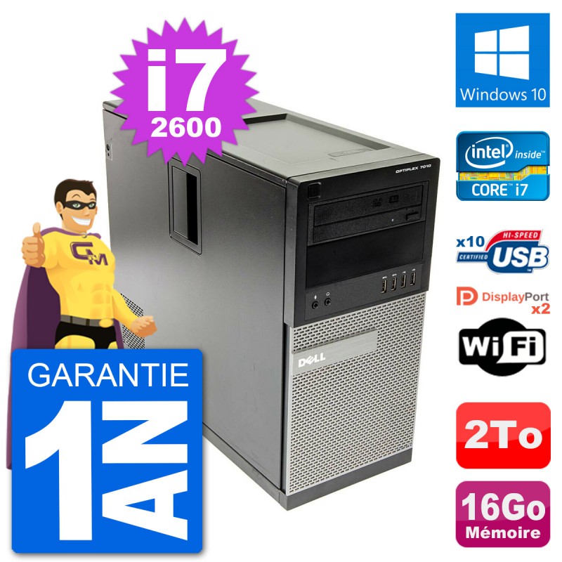 PC Dell Optiplex 7010 MT (Moyenne Tour) - Intel Core i7-2600 3.4 Ghz (8 Mo) - 16 Go DDR3 - Disque Dur 3,5" 2 To - Graveur DVD - Clef Wifi USB - Windows 10 - Garantie 1 an.