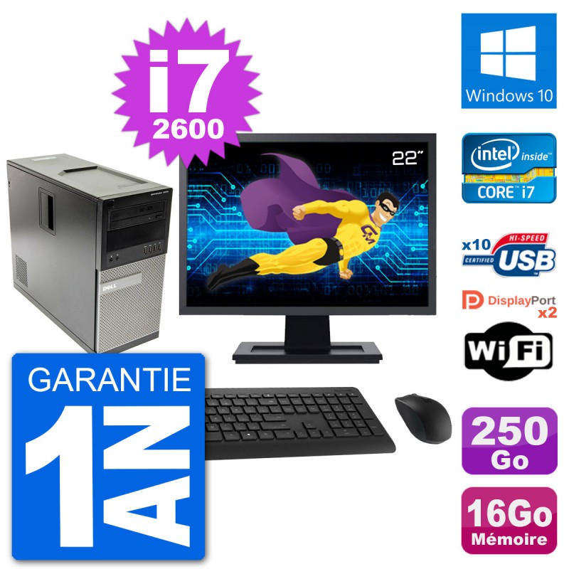 PC Dell 7010 MT - Intel Core i7-2600 3.4 Ghz (8 Mo) - 16 Go DDR3 - Disque Dur 3,5" 250 Go - Graveur DVD - Clef Wifi USB - Windows 10 - Livré avec Ecran 22" + clavier + souris (Marques et modèles variables) - Garantie 1 an.