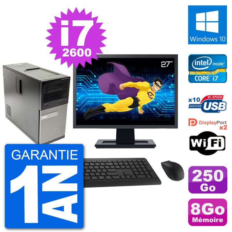 PC Dell 7010 MT - Intel Core i7-2600 3.4 Ghz (8 Mo) - 8 Go DDR3 - Disque Dur 3,5" 250 Go - Graveur DVD - Clef Wifi USB - Windows 10 - Livré avec Ecran 27" + clavier + souris (Marques et modèles variables) - Garantie 1 an.