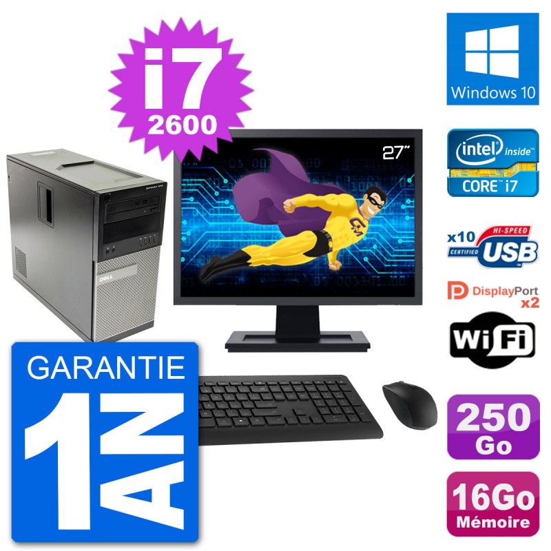 PC Dell 7010 MT - Intel Core i7-2600 3.4 Ghz (8 Mo) - 16 Go DDR3 - Disque Dur 3,5" 250 Go - Graveur DVD - Clef Wifi USB - Windows 10 - Livré avec Ecran 27" + clavier + souris (Marques et modèles variables) - Garantie 1 an.