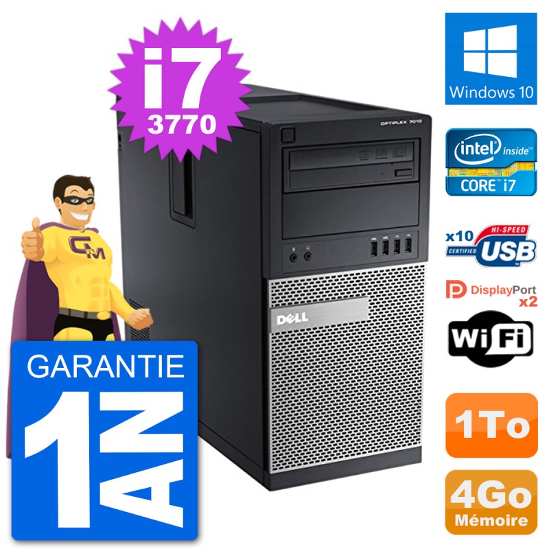 PC Dell Optiplex 7010 MT (Moyenne Tour) - Intel Core i7-3770 3.4 Ghz (8 Mo) - 4 Go DDR3 - Disque Dur 3,5" 1 To - Graveur DVD - Clef Wifi USB - Windows 10 - Garantie 1 an.