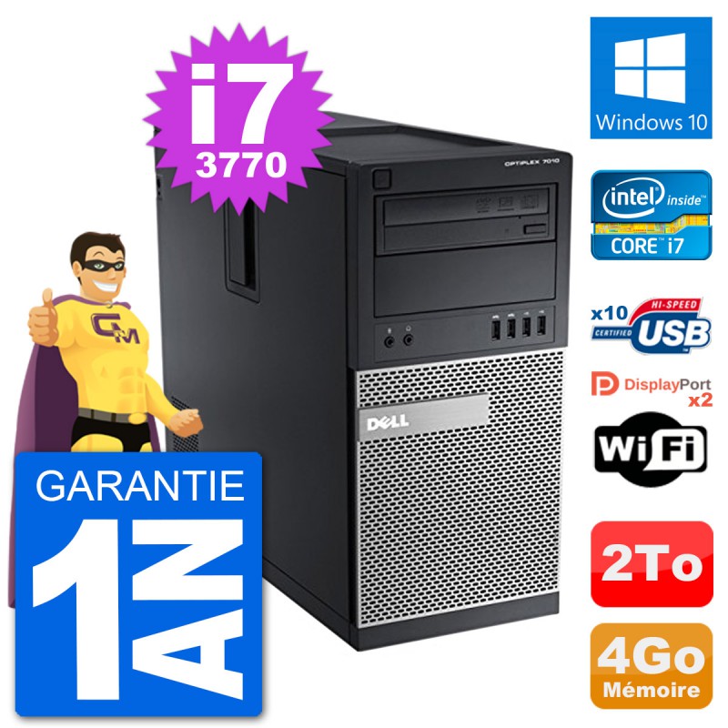 PC Dell Optiplex 7010 MT (Moyenne Tour) - Intel Core i7-3770 3.4 Ghz (8 Mo) - 4 Go DDR3 - Disque Dur 3,5" 2 To - Graveur DVD - Clef Wifi USB - Windows 10 - Garantie 1 an.