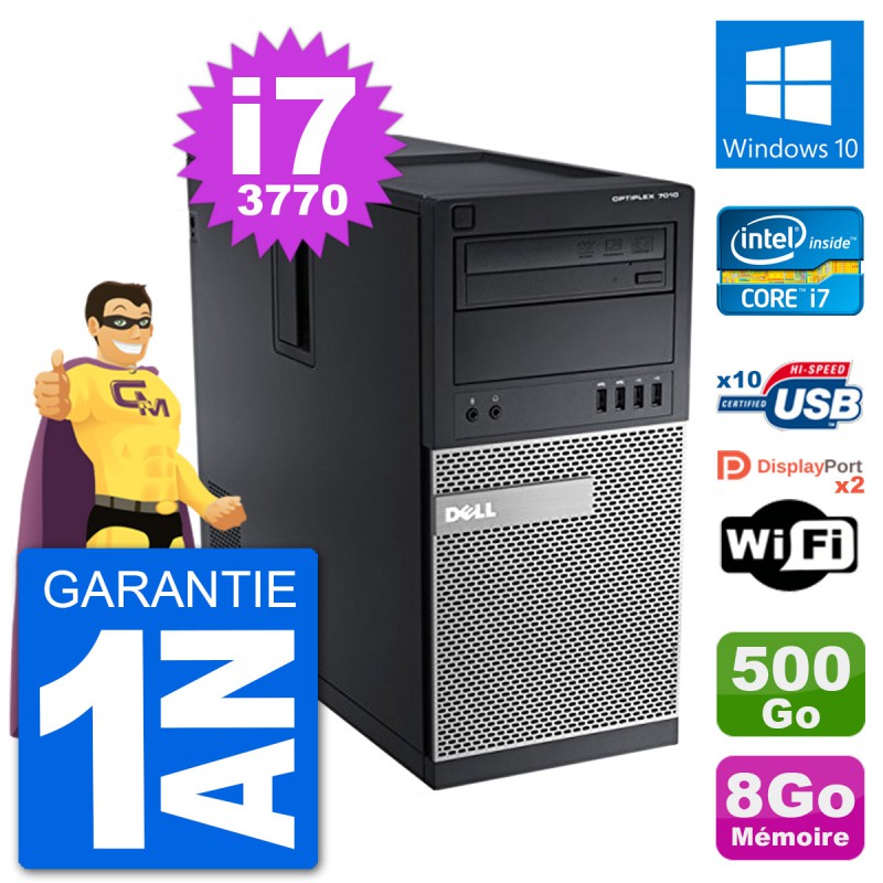 PC Dell Optiplex 7010 MT (Moyenne Tour) - Intel Core i7-3770 3.4 Ghz (8 Mo) - 8 Go DDR3 - Disque Dur 3,5" 500 Go - Graveur DVD - Clef Wifi USB - Windows 10 - Garantie 1 an.