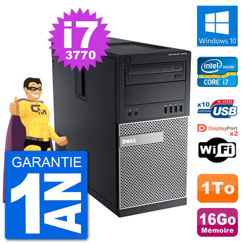PC Dell Optiplex 7010 MT (Moyenne Tour) - Intel Core i7-3770 3.4 Ghz (8 Mo) - 16 Go DDR3 - Disque Dur 3,5" 1 To - Graveur DVD - Clef Wifi USB - Windows 10 - Garantie 1 an.