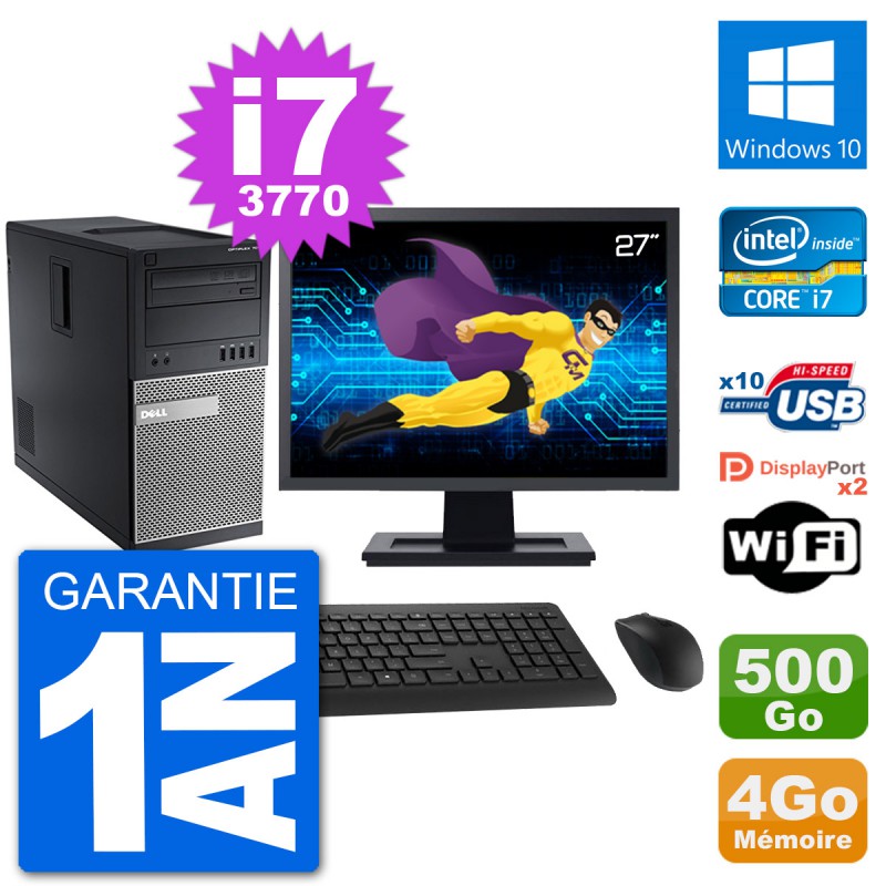 PC Dell 7010 MT - Intel Core i7-3770 3.4 Ghz (8 Mo) - 4 Go DDR3 - Disque Dur 3,5" 500 Go - Graveur DVD - Clef Wifi USB - Windows 10 - Livré avec Ecran 27" + clavier + souris (Marques et modèles variables) - Garantie 1 an.