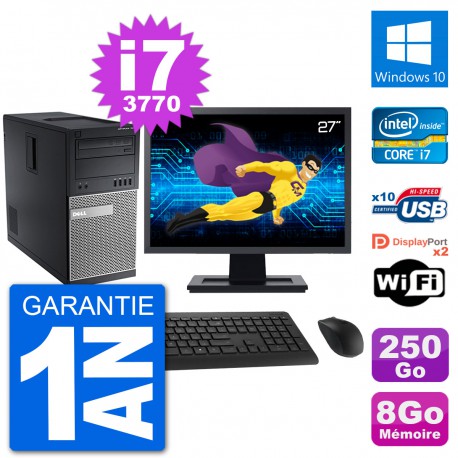 PC Dell 7010 MT - Intel Core i7-3770 3.4 Ghz (8 Mo) - 8 Go DDR3 - Disque Dur 3,5" 250 Go - Graveur DVD - Clef Wifi USB - Windows 10 - Livré avec Ecran 27" + clavier + souris (Marques et modèles variables) - Garantie 1 an.